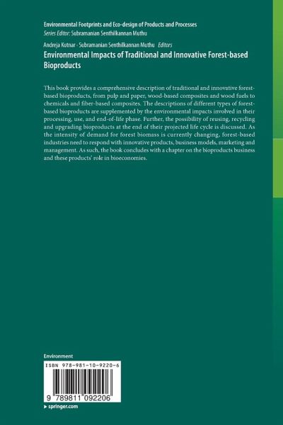 Introduction.- Forest-based bioproducts.- Cascade use of forest-based bioproducts.- Environmental impacts of wood processing.- Environmental impacts of use, maintenance, repair and refurbishment of forest-based bioproducts.- Service life and end of life of forest-based bioproducts & their environmental implications.- Climate change & wood-based products.- Reuse, recycle and upgrading of forest-based bioproducts.- Eco-labels of forest-based bioproducts.- Business - bioproducts in bioeconomy.