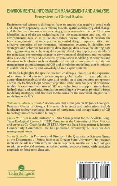 Most environmental studies are based upon data collected at fine spatial scales plots, sediments, cores, etc.. Furthermore, temporal scales of these studies have been relatively short days, weeks, months and few studies have exceeded three years duration the typical funding cycle.; Despite this history, environmental scientists are now being called upon to extrapolate findings from "plot-level" studies to broader spatial scales and from short-term studies to longer temporal scales, up to decades for questions related to long-term processes such as global warming and the rise in sea level.; The complex questions being addressed internationally require that scientists take advantage of new technologies including remote sensing, geographic information systems GIS, and powerful climatic and environmental simulation models. As more environmental scientists begin to work at these broader spatial and temporal scales, and to utilize many of the newer technologies, they are recognising a whole new class of problems.; This book aims to address the most pertinent issues, and includes a comprehensive review of selected topics, case studies, and theoretical discussions, divided into seven sections each preceded by a brief introduction.