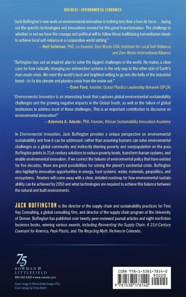 A guide for our future that Booklist praises as "a practical and compelling deep dive into high-level solutions to address climate change, its impact on the economy, and our very survival." Defines the challenges facing climate goals and offers achievable solutions to meet these goals by 2050-without sacrificing economic growth. Climate change and other environmental dangers are considered an existential threat, yet mankind is falling further behind in addressing these challenges. Policies aimed at fixing these issues have consistently missed the mark by focusing on the symptoms, such as CO2 emissions, rather than the root cause problems, such as the limitations of human systems and global poverty. In Environmental Innovation, Jack Buffington provides a unique perspective on environmental sustainability and how it can be addressed: rather than assuming humans can solve environmental challenges as a global community and indirectly blaming poverty and overpopulation on the poor, Buffington points to 21st-century solutions to reduce poverty levels, transform human systems, and enable environmental innovation. If we correct the failures of environmental policy that has existed for five decades, there are great possibilities for solving the planet's existential crisis. Buffington also highlights innovation opportunities in energy, food systems, water, materials, geopolitics, and ecosystems. Ultimately, Environmental Innovation provides a comprehensive perspective of how the world needs to define the problem of environmental sustainability, with specific focus on the great divide between the rich Global North and the poor and developing Global South. Readers will come away with a clear, detailed roadmap for how environmental sustainability can be achieved by 2050 and what technologies are required to achieve this balance between the natural and built environments. For humanity to succeed, Buffington argues we must replace the grandiose notions of the so-called global community and instead create new models for action that are consistent with human progress over thousands of years.