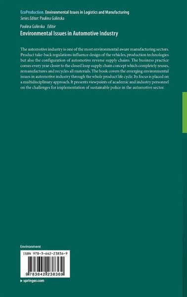 The automotive industry is one of the most environmental aware manufacturing sectors. Product take-back regulations influence design of the vehicles, production technologies but also the configuration of automotive reverse supply chains. The business practice comes every year closer to the closed loop supply chain concept which completely reuses, remanufactures and recycles all materials. The book covers the emerging environmental issues in automotive industry through the whole product life cycle. Its focus is placed on a multidisciplinary approach. It presents viewpoints of academic and industry personnel on the challenges for implementation of sustainable police in the automotive sector