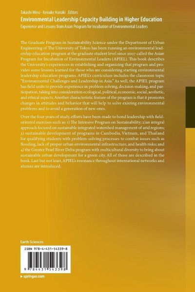 The Graduate Program in Sustainability Science under the Department of Urban Engineering of The University of Tokyo has been running an environmental leadership education program at the graduate student level since 2007 called the Asian Program for Incubation of Environmental Leaders (APIEL). This book describes the University's experiences in establishing and organizing that program and provides some lessons learned for those who are considering starting environmental leadership education programs. APIEL's curriculum includes the classroom topic "Environmental Challenges and Leadership in Asia." As well, the APIEL program has field units to provide experience in problem solving, decision making, and participation, taking into consideration ecological, political, economic, social, aesthetic, and ethical aspects. Another characteristic feature of the program is that it promotes changes in attitudes and behavior that will help to solve existing environmental problems and to avoid a generation of new ones.