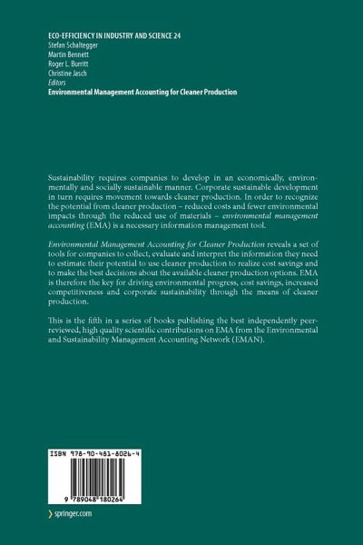 Environmental Management Accounting for Cleaner Production reveals a set of tools for companies to collect, evaluate and interpret the information they need to estimate their potential to use cleaner production to realize cost savings and to make the best decisions about the available cleaner production options. EMA is therefore the key for driving environmental progress, cost savings, increased competitiveness and corporate sustainability through the means of cleaner production.