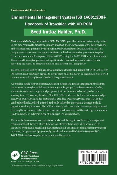 Environmental Management System ISO 14001:2004 provides the information and practical know-how required to facilitate a smooth adoption and incorporation of the latest revisions and enhancements put forth by the International Organization for Standardization. This unique work shows how to adopt or transition to the documentation procedures required for an Environmental Management System (EMS) using the 14001:2004 series of standards. These globally accepted procedures help eliminate waste and improve efficiency, while providing the means to achieve both local and international compliance. This tool supplies step-by-step guidance on how to develop and implement an EMS that, with little effort, can be instantly applied to any process-related industry or organization interested in environmental compliance, whether it is regulated or not. A complete, single-source reference, written in simple and precise language, the book puts the answers to complex and thorny issues at your fingertips. It includes samples of policy statements, objectives, targets, and programs that can be amended or adopted without wasting time re-inventing the wheel. The CD-ROM includes customizable Standard Operating Procedures (SOPs) that can be downloaded, edited, printed, and easily tailored to incorporate changes and add organizational requirements. The SOPs exclusively refer to the documents specially required for compliance; however other formats are included to ensure that the soft copy can be easily used worldwide in a diverse range of industries and organizations. The book helps minimize documentation and avoid the nightmare faced by management representatives at the time of certification. An effective time saver when you are in the process of writing and organizing documentation for certification and further improvement purposes, this book and CD-ROM package helps you easily translate the revised ISO 14001:1