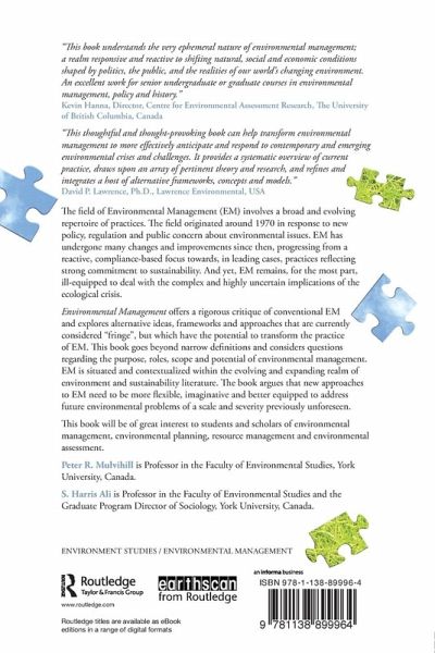 The field of Environmental Management (EM) involves a broad and evolving repertoire of practices. The field originated around 1970 in response to new policy, regulation and public concern about environmental issues. EM has undergone many changes and improvements since then, progressing from a reactive, compliance-based focus toward, in leading cases, practices reflecting strong commitment to sustainability. And yet, EM remains, for the most part, ill-equipped to deal with the complex and highly uncertain implications of the ecological crisis. Environmental Management offers a rigorous critique of conventional EM and explores alternative ideas, frameworks and approaches that are currently considered "fringe", but which have the potential to transform the practice of EM. This book goes beyond narrow definitions and considers questions regarding the purpose, roles, scope and potential of environmental management. EM is situated and contextualized within the evolving and expanding realm of environment and sustainability literature. The book argues that new approaches to EM need to be more flexible, imaginative and better equipped to address future environmental problems of a scale and severity previously unforeseen. This book will be of great interest to students and scholars of environmental management, environmental planning, resource management, and environmental assessment.