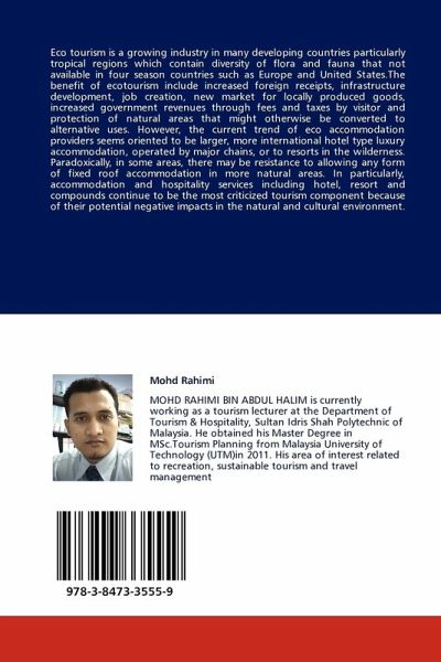 Eco tourism is a growing industry in many developing countries particularly tropical regions which contain diversity of flora and fauna that not available in four season countries such as Europe and United States.The benefit of ecotourism include increased foreign receipts, infrastructure development, job creation, new market for locally produced goods, increased government revenues through fees and taxes by visitor and protection of natural areas that might otherwise be converted to alternative uses. However, the current trend of eco accommodation providers seems oriented to be larger, more international hotel type luxury accommodation, operated by major chains, or to resorts in the wilderness. Paradoxically, in some areas, there may be resistance to allowing any form of fixed roof accommodation in more natural areas. In particularly, accommodation and hospitality services including hotel, resort and compounds continue to be the most criticized tourism component because of theirpotential negative impacts in the natural and cultural environment.