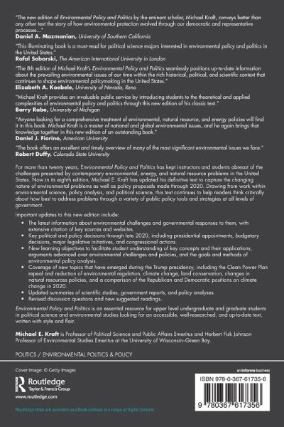 For more than twenty years, Environmental Policy and Politics has kept instructors and students abreast of the challenges presented by contemporary environmental, energy, and natural resource problems in the United States. Now in its eighth edition, Michael E. Kraft has updated his definitive text to capture the changing nature of environmental problems as well as policy proposals made through 2020. Drawing from work within environmental science, policy analysis, and political science, this text continues to help readers think critically about how best to address problems through a variety of public policy tools and strategies at all levels of government.