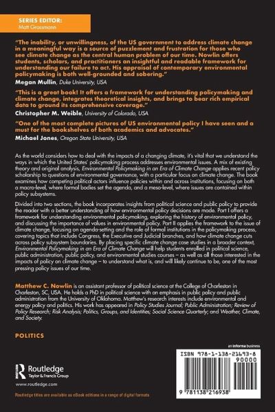 A mix of existing political theory and original analysis, this book applies recent policy scholarship to questions of environmental governance, with a particular focus on climate change.