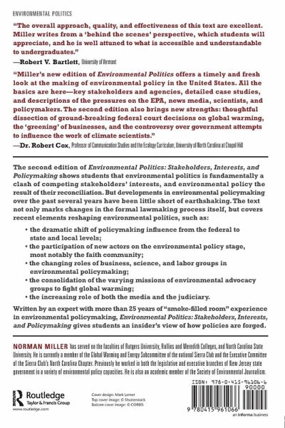 "Miller's new edition of Environmental Politics offers a timely and fresh look at the making of environmental policy in the United States. All the basics are here-key stakeholders and agencies, detailed case studies, and descriptions of the pressures on the EPA, news media, scientists, and policy-makers. The second edition also brings new strengths: thoughtful dissection of ground-breaking federal court decisions on global warming, the 'greening' of businesses, and the controversy over government attempts to influence the work of climate scientists."