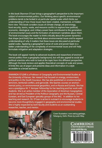 Shannon O'Lear brings a geographer's perspective to environmental politics. The book considers issues of climate change, energy, food security, toxins, waste, and resource conflict to explore how political, economic, ideological and military power have contributed to the generation of environmental issues and the formation of dominant narratives about them. The book encourages the reader to think critically about the power dynamics that shape (and limit) how we think about environmental issues and to expand the reader's understanding of why it matters that these issues are discussed at particular spatial scales. Applying a geographer's sense of scale and power leads to a better understanding of the complexity of environmental issues and will help formulate mitigation and adaptation strategies. The book will appeal mainly to advanced students and researchers from a geography background, but also to social and political scientists who wish to look at the topic from this different perspective.