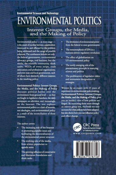 At every stage, environmental policy is the result of the combat of stakeholders interested in, and affected by, the problem being addressed and the range of possible solutions. The combatants include any or all of the following: the federal government, environmental advocacy groups, and business, the media, the scientific community, think tanks, NGOs of every stripe, trade associations and professional organizations, and even state and local governments, each of whom have their own interests in the resulting policy. Environmental Politics: Interest Groups, the Media, and the Making of Policy discusses political battles over the environment from ground level - as they are fought in legislative chambers, the daily newspaper, on television, and, increasingly, on the Internet. The text explores environmental politics as a clash of interests, not ideologies, and environmental policy as a result of the reconciliation of those interests. The author covers not only the conventional aspects of the policymaking process but more recent and less recognized elements and developments such as: Proliferation of legislative riders and monument designations as major environmental strategies Evolving role of the media, from science popularizer to agenda setter Growing influence on both Congress and the public of conservative and libertarian foundations and think tanks Devolution of environmental power from the Federal to state governments Metamorphosis of EPA in a business-driven regulatory revolution Effect of globalization on US environmental policy Newly emerging role of the precautionary principle in marrying science and politics Increasing role of the Internet in promoting populist issues and promoting the decentralization of the environmental power structure No other book covers the politics of the environment the way this one does. Written by an expert with 25 years of experience in environmental policymaking, Environmental Politics: Interest Groups, the Media, and the Making of Policy gives you an insider's view of how policies are forged. By examining these issues through an interest group lens, this book not only accounts for what policies have been adopted but also shows how you can influence policy and effect change.