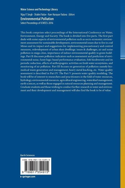 1. Socio-Economic Environment Assessment for Sustainable Development, by Atul Kumar Rahul.- 2. Research Need on Environmental Gains in Conservation Induced Relocation, by Surendra Singh Rajpoot.- 3. Environmental Issues due to Fire in Coal Mines its Impact and Suggestions for Implementing Precautionary and Control Measures, by R.V. K. Singh.- 4. Redevelopment of Urban Slum Dwellings: Issues & Challenges, by Dhrupad Rupwate.- 5. Importance of Indoor Environmental Quality in Green Buildings, by Alisha Patnaik. -6. Meteorological Factors Influencing Dispersion of Vehicular Pollution in a Typical Highway Condition, by Rajni Dhyani.- 7. Study of Air and Noise Pollution in Mega Cities of India, by Amrit Kumar.- 8. A Critical Review on Air Quality Index- Shweta Kumari.- 9. Aquatic Insects as Pollution Indicator- A Study in Cachar, Assam, North East India, by Arpita Dalal.- 10. Monitoring of Air Pollution in Different Region Along Road network, Jharia Coalfield, Dhanbad, India, by Shiv Kumar Yadav.- 11. Spatial Distribution and Baseline Concentration of Heavy Metals in Swell-Shrink Soils of Madhya Pradesh, India, by Rajendiran, S..- 12. Associative Study of Aerosol Pollution, Precipitation and Vegetation in Indian Region [2000-2013], by Manu Mehta.- 13. Fuzzy Logic Based Performance Evaluation of EIA Reports for Hydroelectric Projects, by Purbashree Sarmah.- 14. Assessment and Prediction of Environmental Noise Generated by Road Traffic in Nagpur City, India, by Sameer. S. Pathak.- 15. Time Dependent Study of Electromagetic Field and Indoor Meteorological Parameters in Individual Working Environment, by A.K.Mishra.- 16. Fish Biodiversity and Its Periodic Reduction - A Case Study of River Narmada in Central India, by Muslim Ahmad Shah.- 17. Effects of Anthropogenic Activities on the Fresh Water Ecosystem- A Case Study of Kappithodu in Kerala, by Sherly P Anand.- 18. Degradation of Heptachlor by High Carbon Iron Filings (HCIF) by Alok Sinha.- 19. Biomedical Waste Generation and Management in Public Sector Hospital in Shimla City, by Prachi Vasistha.- 20. Fuel Loss and Related Emissions Due to Idling of Motorized Vehicles at a Major Intersection in Delhi, by Niraj Sharma.- 21. Emission Inventorisation and Modelling of Non-Methane Volatile Organic Compounds from Petrol Distribution Centres in an Urban Area, by Sunil Gulia.- 22. Comprehensive Physico-Chemical Characterization of Coal Combustion Residues from a Thermal Power Station of India, by Ritesh Kumar.- 23. Influence of Semi-Arid Climate on Characterisation of Domestic Wastewater, by Vinod Kumar Tripathi.- 24. Anomalous Features of Black Carbon and Particulate Matter Observed over a Rural Station during Diwali Festival of 2015, by P.C.S. Devara.- 25. Heavy Metal Leaching Potential of Discarded Mobile Phones Wastes: A Laboratory Based Study, by Devika Bajpai.- 26. Decolorizetion of Reactive Yellow 17 Dye Using Aspergillus Tamar II, by Anuradha Singh.- 27. Discovery of the Helium Rare Gas in SaugorDivision, Southern Ganga Basin, Bundelkhand Region, M.P., INDIA, by A. K. Shadilya.- 28. How Soil Texture Affects the Organic Carbon Load in the Mangrove Ecosystem a Case Study from Bhitarkanika, Odisha by Kakoli Banerjee.- 29. Recent Developments in Deeluoridation of Drinking Water in India, by Swati Dubey.- 30. Water Quality Assessment and Correlation Study of Physico-Chemical Parameters of Sukinda Chromite Mining Area, Orissa, India, R.K. Tiwary.- 31. Water Quality Assessment of a Lentic Water Body Using Remote Sensing - A Case Study, by Purandara B. K.- 32. Assessment of Trends in Water Quality of Khadakwasla Reservoir Using CCME-WQI, by Savitri K. Hansda.- 33. Assessment of Agricultural Water Quality of Shallow Groundwater between Budhni and Chaursakhedi, North of River Narmada, District Sehore, Madhya Pradesh, India, by Sunil Kumar Sharma.- 34. Active Water Quality Management in Rural Small Watersheds, by Koichi Unami.- 35. Evaluation of the Surface Water Quality Index of JhariaCoal Mining Region and its Management of Surface water Resources, by Prasoon Kumar Singh.- 36. Studies on the Production of Salt Tolerant Alkaline Protease Isolated from Proteus Mirabilis and Its Degradation of Hyper-Saline Soak Liquor, by Maharaja.P.- 37. Relative Contribution of Phosphorus from Various Sources to the Upper Lake, Bhopal by M. Vassanda Coumar.- 38. Assessment of Fluoride in Rain-fed and Irrigated Agricultural Soil of Tonalite-Trondjhemite Series in Central India, by Bijendra Kumar.- 39. Biomonitoring of Paravur Lake in Kerala Using Macro-Invertebrates, by Sreeja .J.- 40. Change Detection of Sodic Landinraebareli District Using Remote Sensing and GIS Techniques by Arif Ahmad.- 41. Process Modelling of Gas-Liquid Stirred Tank with Neural Networks, by Neha Phukon.- 42. Identification and Planning of Water Quality Monitoring Network in Context of Integrated Water Resource Management (IWRM), by Surjeet Singh.- 43. An Updated Review on Quantitative and Qualitative Analysis,by Shreya Gaur.- 44. Ensemble MCDM Approach to Determine Priorities of Parameters for WQI, by Ritabrata Roy.- 45. Aerosol Optical Depth Variation During A Recent Dust Event In North India.