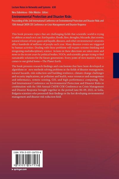 The book presents research findings and conclusions that have been developed as algorithms or new methods solving problems in the fields of disaster management, natural hazards, risk reduction and building resilience, climate change challengesand security implications, air pollution and health, water resources and management and informatics, remote sensing, GIS, and high-performance computing. The 2nd International Conference on Environmental Protection and Disaster Risks in combination with the 10th Annual CMDR COE Conference on Crisis Management and Disaster Response brought together in the period June 06-09, 2022, in Sofia, Bulgaria scientists who presented their findings in the fast developing environmental management and disaster risk reduction field.