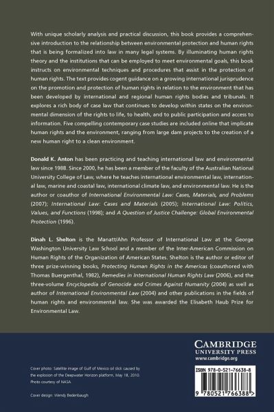 With unique scholarly analysis and practical discussion, this book provides a comprehensive introduction to the relationship between environmental protection and human rights being formalized into law in many legal systems. This book instructs on environmental techniques and procedures that assist in the protection of human rights. The text provides cogent guidance on a growing international jurisprudence on the promotion and protection of human rights in relation to the environment that has been developed by international and regional human rights bodies and tribunals. It explores a rich body of case law that continues to develop within states on the environmental dimension of the rights to life, to health, and to public participation and access to information. Five compelling contemporary case studies are included that implicate human rights and the environment, ranging from large dam projects to the creation of a new human right to a clean environment.