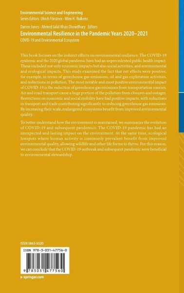 This book focuses on the indirect effects on environmental resilience. The COVID-19 epidemic and the 2020 global pandemic have had an unprecedented public health impact. These included not only economic impacts but also social activities, and environmental and ecological impacts. This study examined the fact that net effects were positive, for example, in terms of greenhouse gas emissions, oil and gas exploration activities, and reductions in pollution. The most notable and most positive environmental impact of COVID-19 is the reduction of greenhouse gas emissions from transportation sources.…mehr