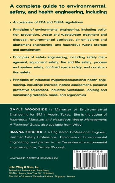 A complete guide to environmental, safety, and health engineering, including an overview of EPA and OSHA regulations; principles of environmental engineering, including pollution prevention, waste and wastewater treatment and disposal, environmental statistics, air emissions and abatement engineering, and hazardous waste storage and containment; principles of safety engineering, including safety management, equipment safety, fire and life safety, process and system safety, confined space safety, and construction safety; and principles of industrial hygiene/occupational health engineering including chemical hazard assessment, personal protective equipment, industrial ventilation, ionizing and nonionizing radiation, noise, and ergonomics.