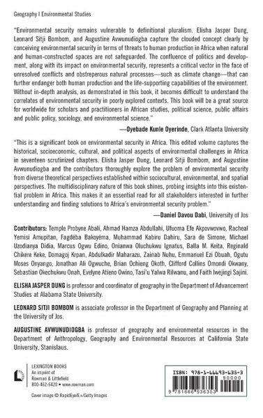 List of Tables and Figures Preface Acknowledgments List of Abbreviations Introduction Elisha Jasper Dung, Leonard Sitji Bombom and Augustine Avwunudiogba Part I: Conceptual and Theoretical Considerations Chapter 1: The Geography of Environmental Security in Africa Elisha Jasper Dung Chapter 2: Globalization, Climate Change, and Environmental Security in Africa Augustine Avwunudiobga and Ufuoma Efe Akpovwovwo Chapter 3: Access to Environmental Resources: A Framework for Understanding the Drivers of Environmental Conflict Sabastian Okechukwu Onah, Jonathan Ali Ogwuche, and Muhammad Kabiru Dahiru Chapter 4: Environmental Conflicts, Politics, and Development in Africa: A Review Fagdéba Bakoyéma Chapter 5: Climate and Environmental Changes: A Nexus of Environmental Changes in Sub-Saharan Africa Ahmad Hamza Abdullahi and Abdulkadir Maharazu Part II: Conflicts and Politics of Environmental Security Chapter 6: Threats, Triggers, and Tipping Points of Conflicts: A Case Study of North Central Nigeria, 2002?2022 Zainab Nuhu and Tasi'u Yalwa Rilwanu Chapter 7: The Impact of Ethiopian Dams on the Environment in Northeast Africa Domagoj Krpan Chapter 8: Revisiting the 2006 Toxic Waste Dump Incident in Cote d'Ivoire Balla M. Keita Chapter 9: Implementation and Enforcement of Sustainability Provisions in Regional Trade Agreements in Africa Moses Onyango Ogutu Chapter 10: Dimensions of Environmental Conflicts in the Niger Delta of Nigeria, 1956?2015 Emmanuel Ezi Obuah and Reginald Chikere Keke Chapter 11: Herdsmen-Farmers Conflict in Nigeria's Middle Belt Region Leonard Sitji Bombom, Racheal Yemisi Amupitan, and Marcus Ogwu Edino Chapter 12: Forests: The Environmental Theatre for Internal Security Operations in Nigeria Oluchukwu Ignatus Onianwa Part III: Environmental Security and Development Chapter 13: Socioeconomic Impact of Land Swamp Reclamation: Implications for Environmental Security in the Niger Delta Region, Nigeria Michael Uzodianya Didia and Temple Probyne Abali Chapter 14: Environmental Security in Kenya: A Case of Geothermal Projects in Samburu and Narok Counties Clifford Collins Omondi Okwany, Evelyn Atieno Owino and Brian Ocheing Okoth Chapter 15: Mangrove Forest Management in Africa Ufuoma Efe Akpovwovwo Chapter 16: Population Growth and Resource Exploitation: Implications for Environmental Security in Nigeria Faith Iwejingi Sajini Chapter 17: "Land Grabs" and the "Local Community": The Search for Human Security between Participation and Patronage in South Sudan Sara de Simone Conclusion: Environmental Security in Africa: The Way Forward Elisha Jasper Dung, Leonard Sitji Bombom and Augustine Avwunudiogba About the Editors About the Contributors