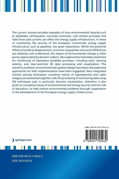 The current volume provides examples of how environmental hazards such as landslides, earthquakes, mountain processes, cold climate processes and tidal flows and currents can affect the energy supply infrastructure. In times of uncertainty, the security of the European cross-border energy supply infrastructure, such as pipelines, has great importance. Whilst the potential effects of political disagreement, economic inequalities and social differences are relatively well understood, the impact of environmental change is often poorly appreciated by decision-makers. New approaches have been examined for monitoring of hazardous landslide processes, including early warning systems, and near-real-time 3D data processing and visualization. The scientific problems of environmental systems design have been discussed and approaches for their implementation have been suggested. New integrated remote sensing techniques consisting mainly of hyperspectral and radar imagery are presented togetherwith the processing of monitoring data using GIS techniques and, in particular, dynamic visualization. Attention is also given to conceptual issues of environmental and energy security and the role of education, to help resolve environmental problems through cooperation in the development of the European energy supply infrastructure.