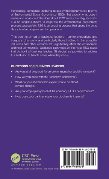 This book is aimed at business leaders and particularly those involved in the extractive industries and other ventures that significantly affect the environment and host communities. Guidance is provided on the major ESG issues that confront all business leaders. Strategies are provided to address ESG risk and to handle crises when they occur.