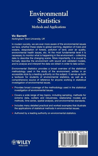 In modern society, we are ever more aware of the environmental issues we face, whether these relate to global warming, depletion of rivers and oceans, despoliation of forests, pollution of land, poor air quality, environmental health issues, etc. At the most fundamental level it is necessary to monitor what is happening in the environment - collecting data to describe the changing scene. More importantly, it is crucial to formally describe the environment with sound and validated models, and to analyse and interpret the data we obtain in order to take action. Environmental Statistics provides a broad overview of the statistical methodology used in the study of the environment, written in an accessible style by a leading authority on the subject. It serves as both a textbook for students of environmental statistics, as well as a comprehensive source of reference for anyone working in statistical investigation of environmental issues. * Provides broad coverage of the methodology used in the statistical investigation of environmental issues. * Covers a wide range of key topics, including sampling, methods for extreme data, outliers and robustness, relationship models and methods, time series, spatial analysis, and environmental standards. * Includes many detailed practical and worked examples that illustrate the applications of statistical methods in environmental issues. * Authored by a leading authority on environmental statistics.