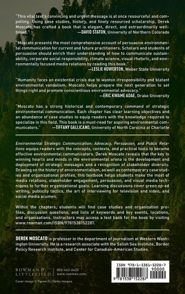 Introduction Chapter 1: Historic Milestones and Trailblazers Chapter 2: Opinion Leadership Chapter 3: Public Relations and Advocacy Chapter 4: Persuasion and Visual Rhetoric Chapter 5: Ethics Chapter 6: Public Scoping and Engagement Chapter 7: Media Relations Chapter 8: Advanced Writing and Visual Tactics Chapter 9: Digital Environmentalism Chapter 10: Corporate Social Responsibility Chapter 11: Community, Accessibility, and Diversity Chapter 12: International Communication Chapter 13: Greening the Field: Communication and Sport Chapter 14: Populism References Index About the Author