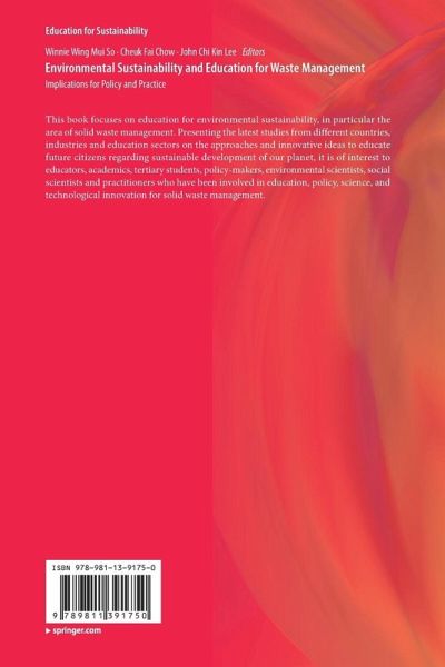 1 Environmental sustainability and education for waste.- Part 1 Policy and Social Responsibility for Waste Management.- 2 E-waste management: Challenge and opportunity.- 3 Solid waste management in Malaysia: The perspectives of non-governmental organizations (NGOs) and youths on consumers' commitment.- 4 The circular economy of plastics in the Netherlands.- 5 Mismanaged plastic waste: Far side of the moon.- 6 Hong Kong needs to embrace a holistic approach to waste management.- Part 2 Environmental Programmes for Schools and Universities, as well as Community Education for Waste Management.- 7 Community and school education on the subject of waste management: Experiences of Romania, the United Kingdom and Germany.- 8 Waste management education: Chinese perspective and experiences.- 9 Waste management and recycling education in Taiwan.- 10 Enhancing pupils' pro-environmental knowledge, attitudes and behaviors on plastic recycling education: A quasi-experimental study in primary schools.-11 Solid waste management in tourist destinations in developing nations: Case studies in Hoi An, Vietnam and Puncak, Indonesia.- 12 A critical cartography of waste education in Australia: Turning to a posthumanist framing.- Part 3 New Science and Technologies for Waste Treatment.- 13 A study on Fenton Technology for Polypropylene Waste Degradation and recovery of high-value chemicals.- 14 Carbon dioxide biosequestration and wastewater treatment using microalgae.- 15 Utilizing different forms of waste sludge in eco-construction material production.- 16 Evaluation of nutritional values of food waste-based feed pellets and common feeding materials for culturing freshwater fish.