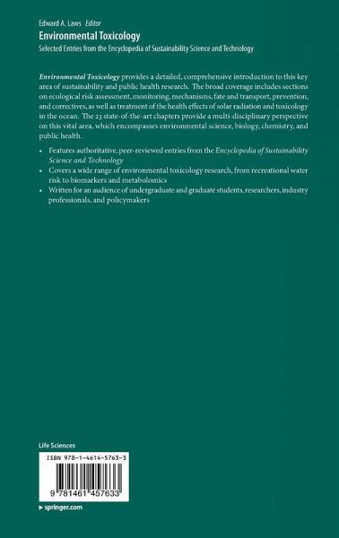 1. Environmental Toxicology, Introduction.- 2. Airborne Toxic Chemicals.- 3. Bioaccumulation/Biomagnifications in Food Chains.- 4. Biomarkers and Metabolomics, Evidence of Stress.- 5. Bioremediation and Mitigation.- 6. Biosensors and Bioassays for Ecological Risk Monitoring and Assessment.- 7. CERCLA, Sustainability and Public and Environmental Health.- 8. Ecological and Health Risks at Low Doses.- 9. Ecological Risk Assessment and Animal Models.- 10. Environmental Toxicology: Carcinogenesis.- 11. Environmental Toxicology: Children at Risk.- 12. Environmental Toxicology: Oxidative Stress.- 13. Harmful Algal Blooms.- 14. Microbial Risk Assessment of Pathogens in Water.- 15. Pathogen and Nutrient Transfer Through and Across Agricultural Soils.- 16. Recreational Water Risk: Pathogens and Fecal Indicators.- 17. Science, Policy, and Risk Management: Case of Seafood Safety.- 18. Sentinel Species in Oceans and Human Health.- 19. Solar Radiation and Human Health.- 20. Toxic Chemical Risks.- 21. Ultraviolet Radiation: Distribution and Variability.- 22. UV Effects on Living Organisms.- 23. Xenobiotic Protection/Resistance Mechanisms in Organisms.- Index.