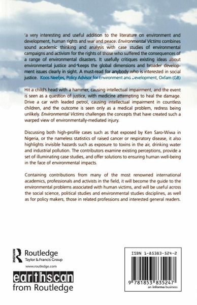 This study looks at environmental problems from the perspective of the victims. The bottom line consequences are often damaging to the health of individuals or communities and they raise a wide range of issues concerning justice, international and environmental law, public health, occupational health and health policy, social policy and welfare, international relations and security. All of these issues are addressed by the contributors, and the work is designed for a spectrum of readers, whether concerned with industrial hazards and occupational health, relevant agreements or treaties, environmental refugees, or the roles of state, business and other actors.