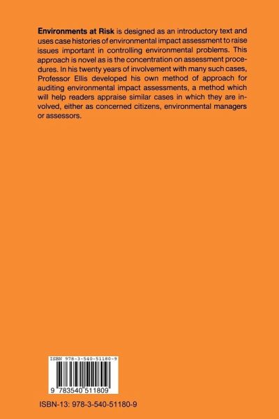 Environments at Risk is designed as an introductory text and uses case histories of environmental impact assessment to raise issues important in controlling environmental problems. This approach is novel as is the concentration on assessment procedures. In his twenty years of involvement with such cases, Professor Ellis developed his own method of approach for auditing environmental impact assessments, a method which will help readers appraise similar cases in which they are involved, either as concerned citizen, environmental managers or assessors.