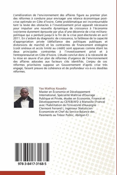 L'amélioration de l'environnement des affaires figure au premier plan des réformes à conduire pour envisager une relance économique post-crise optimale en Côte d'Ivoire. Cette problématique est incontournable tant la levée des obstacles à l'investissement privé apparaît nécessaire pour impulser une nouvelle dynamique de croissance à l'économie ivoirienne durement éprouvée par plus d'une décennie de crise militaro-politique qui a perduré jusqu'à la fin de la crise post-électorale en avril 2011. En s'aidant du diagnostic de croissance, la faiblesse de la capacité d'appropriation privée (défaillance des politiques publiques et distorsions de marché) et les contraintes de financement endogène (coût onéreux et accès limité au crédit) sont apparues comme étant les deux principales contraintes à l'investissement privé et à l'entrepreneuriat en Côte d'Ivoire. L'étude conclut donc à la nécessité de la mise en oeuvre d'un plan de réformes d'urgence de l'environnement des affaires adossées aux facteurs clés identifiés. L'enjeu de ces réformes prioritaires suppose un Gouvernement d'après crise très engagé, faisant preuve de cohérence et de profondeur vis-à-vis desdites réformes.