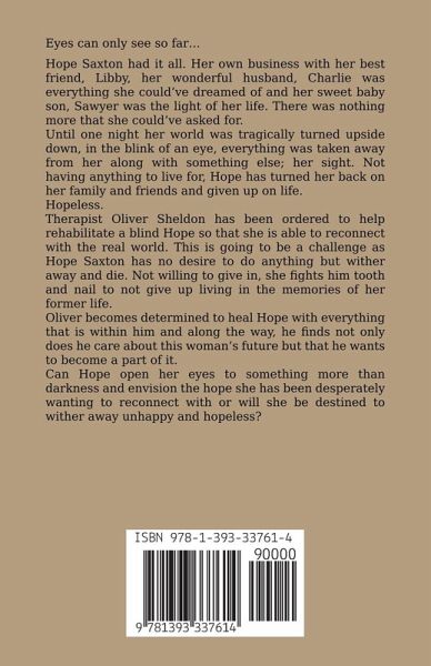 Eyes can only see so far… Hope Saxton had it all. Her own business with her best friend, Libby, her wonderful husband, Charlie was everything she could've dreamed of and her sweet baby son, Sawyer was the light of her life. There was nothing more that she could've asked for. Until one night her world was tragically turned upside down, in the blink of an eye, everything was taken away from her along with something else; her sight. Not having anything to live for, Hope has turned her back on her family and friends and given up on life. Hopeless. Therapist Oliver Sheldon has been ordered to help rehabilitate a blind Hope so that she is able to reconnect with the real world. This is going to be a challenge as Hope Saxton has no desire to do anything but wither away and die. Not willing to give in, she fights him tooth and nail to not give up living in the memories of her former life. Oliver becomes determined to heal Hope with everything that is within him and along the way, he finds not only does he care about this woman's future but that he wants to become a part of it. Can Hope open her eyes to something more than darkness and envision the hope she has been desperately wanting to reconnect with or will she be destined to wither away unhappy and hopeless?