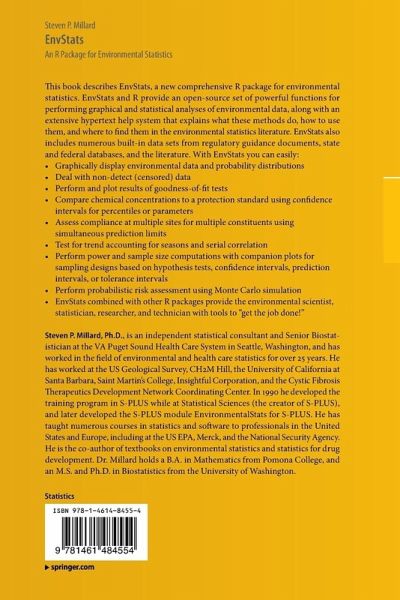 "EnvStats: An R Package for Environmental Statistics by Stephen Millard describes itself as a user manual for the EnvStats R package. ... This book could also be used by practitioners who use statistics in other fields ... . this book was an interesting read, especially in terms of opening my eyes to the work of a statistician working on compliance issues in environmental applications, usually with parametric methods applied in data-poor scenarios." (Peter F. Craigmile, Journal of Agricultural, Biological, and Environmental Statistics, Vol. 22 (1), 2017)