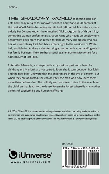 The shadowy world of shifting step-parents and seedy refuges for runaway teenage and young adult parents of the post WWII Britain has many secrets best left buried. For instance, only elderly Pat Dickens knows the enmeshed filial backgrounds of three thirty-something women professionals: Sharon Rains who heads an employment agency that does more than recruit for labour; Mary Thompson who has her way from sleazy East End back streets right to the corridors of Whitehall; and Marion Audrey, a devoted single mother with a demanding role in her family business. They are her arsenal against Burton Macdonald for a half century of lost love. Enters Alex Mwenda, a stranger with a mysterious past and a hand for children; and Marion's are not spared. Soon, she is torn between her faith and the new bliss, unaware that the children are in the eye of a storm. But when they are abducted, she can only tell the man who now loves them more than he loves her. The unlikely warrior loses control in the search for the children that leads to the dense Savernake Forest where lie many other victims of paedophilia and human trafficking.