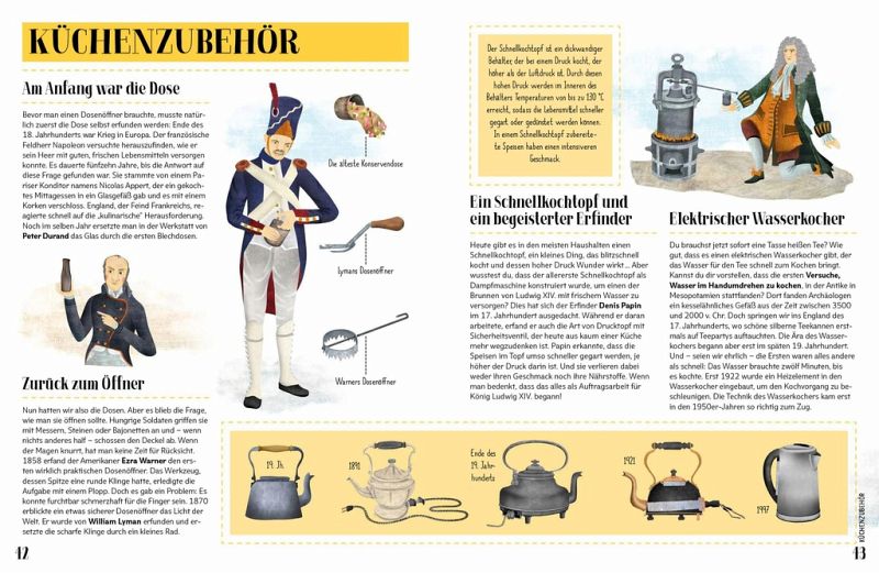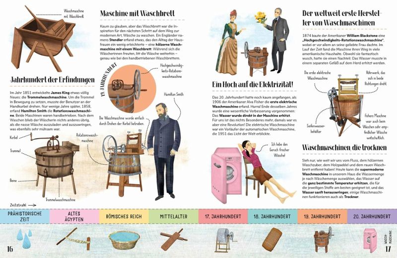 Entdecke mit anschaulichen Illustrationen und verständlichen Texten viele spannende Fakten rund um das ganz alltägliche Leben - von der Vorzeit bis heute! Dank der Zeitachse auf jeder Seite kannst du ganz genau sehen, wie sich praktische Alltagsdinge wie der Wasserkocher, der Kühlschrank oder die Dusche Schritt für Schritt weiterentwickelt haben.