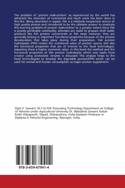 The problem of 'protein malnutrition' as experienced by the world has attracted the attention of nutritionist and much work has been done in this line. Being abundant in supply, fish is a relatively inexpensive source of high quality protein and considered to be the ultimate answer to eradicate this burning problem of protein malnutrition to a greater extent.Since fish is greatly perishable commodity, attempts are made to prepare shelf stable products like fish protein concentrate or fish meal; however, they are generally lacking in important functional properties because of the protein denaturation that takes place during their preparation. Fish protein hydrolysate (FPH) retains the nutritional value of protein source and also the functional properties that are of interest to the food technologist, imparting them a higher economic value. In this book the method and the functional properties of fish protein hydrolysate which was made from crocker using proteolytic enzyme is discussed. This analysis helps to the food technologists to develop the digestible protein(FPH) which can be used for animal and human consumption as major protein supplement.