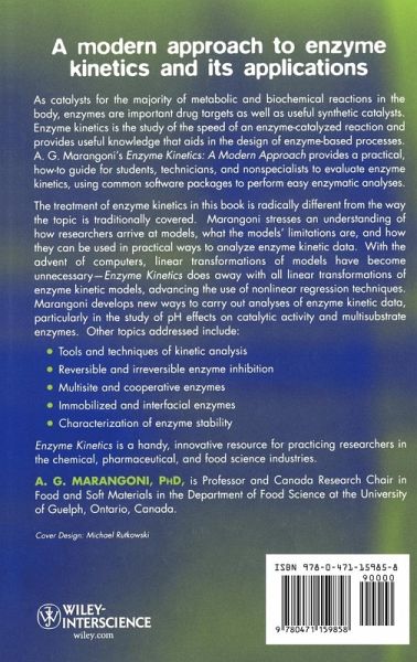 A modern approach to enzyme kinetics and its applications As catalysts for the majority of metabolic and biochemical reactions in the body, enzymes are important drug targets as well as useful synthetic catalysts. Enzyme kinetics is the study of the speed of an enzyme-catalyzed reaction and provides useful knowledge that aids in the design of enzyme-based processes. A. G. Marangoni's Enzyme Kinetics: A Modern Approach provides a practical, how-to guide for students, technicians, and nonspecialists to evaluate enzyme kinetics, using common software packages to perform easy enzymatic analyses. The treatment of enzyme kinetics in this book is radically different from the way the topic is traditionally covered. Marangoni stresses an understanding of how researchers arrive at models, what the models' limitations are, and how they can be used in practical ways to analyze enzyme kinetic data. With the advent of computers, linear transformations of models have become unnecessary-Enzyme Kinetics does away with all linear transformations of enzyme kinetic models, advancing the use of nonlinear regression techniques. Marangoni develops new ways to carry out analyses of enzyme kinetic data, particularly in the study of pH effects on catalytic activity and multisubstrate enzymes. Other topics addressed include: * Tools and techniques of kinetic analysis * Reversible and irreversible enzyme inhibition * Multisite and cooperative enzymes * Immobilized and interfacial enzymes * Characterization of enzyme stability Enzyme Kinetics is a handy, innovative resource for practicing researchers in the chemical, pharmaceutical, and food science industries.