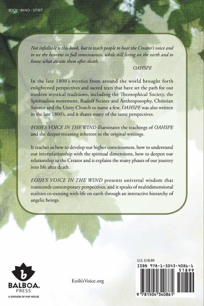 Not infallible is this book, but to teach people to hear the Creator's voice and to see the heavens in full consciousness, while still living on the earth and to know what awaits them after death. OAHSPE In the late 1800's mystics from around the world brought forth enlightened perspectives and sacred texts that have set the path for our modern mystical traditions, including the Theosophical Society, the Spiritualists movement, Rudolf Steiner and Anthroposophy, Christian Science and the Unity Church to name a few. OAHSPE was also written in the late 1800's, and it shares many of the same perspectives. EOIH'S VOICE IN THE WIND illuminates the teachings of OAHSPE and the deeper meaning inherent in the original writings. It teaches us how to develop our higher consciousness, how to understand our interrelationship with the spiritual dimensions, how to deepen our relationship to the Creator and it explains the many phases of our journey into life after death. EOIN'S VOICE IN THE WIND presents universal wisdom that transcends contemporary perspectives, and it speaks of multidimensional realities co-existing with life on earth through an interactive hierarchy of angelic beings.