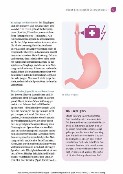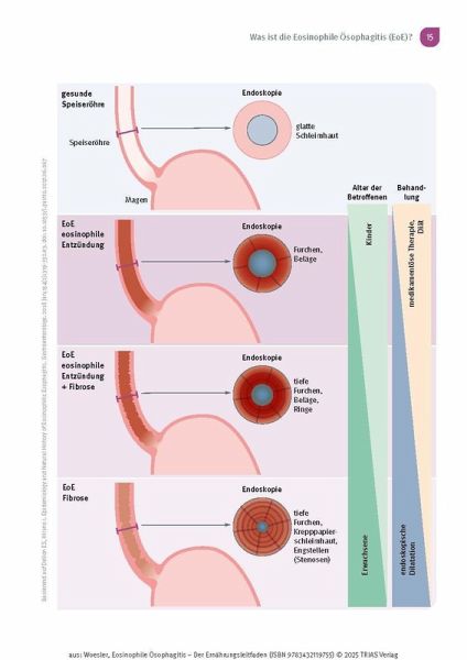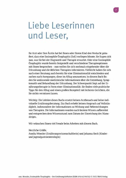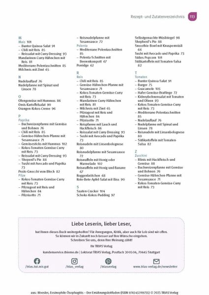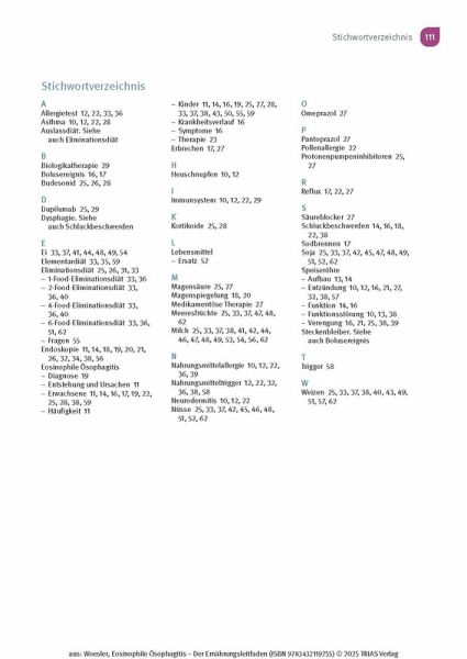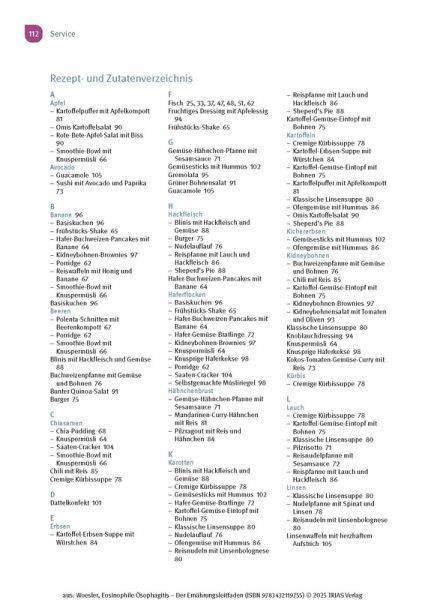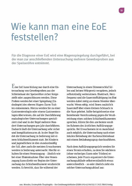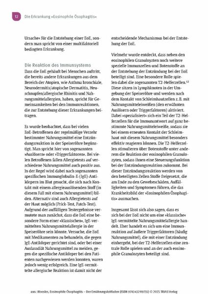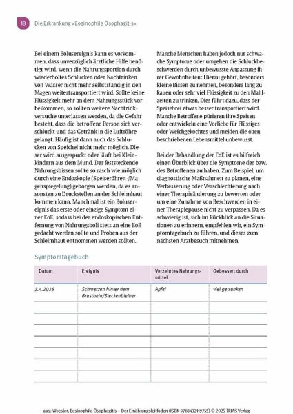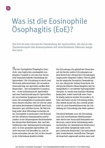 Sodbrennen, Schluckbeschwerden, Schmerzen hinter dem Brustbein, Steckenbleiber, Übelkeit und Erbrechen: Solche Symptome können auf eine EoE hinweisen, denn bei dieser immunvermittelten Erkrankung ist die Speiseröhre durch eine Entzündung beeinträchtigt. Steht die Diagnose nach einer Endoskopie fest, gilt es, die passende Therapie zu wählen. In diesem Ratgeber geht es um die Ernährungstherapie mittels der 2-, 4-, oder 6-Food-Eliminationsdiät. Hier finden Sie eine konkrete Anleitung und Rezepte für die Vorbereitung und Durchführung der Diätphase sowie für die anschließende Wiedereinführung von Lebensmitteln. So können individuelle Trigger identifiziert und Medikamente reduziert werden, wenn die Ernährungstherapie anschlägt.