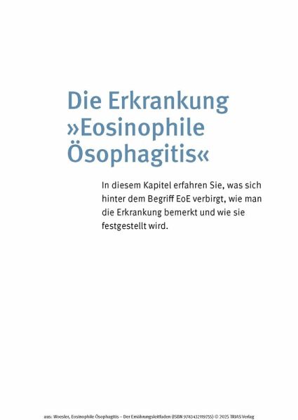 - Den medizinischen Hintergrund kennen: Hier finden Sie den aktuellen Stand der Forschung zu der Erkrankung verständlich erklärt: Wie die Entzündung in der Speiseröhre entsteht und diese verändert, wie die Untersuchungen ablaufen und welche Behandlungsoptionen neben der Ernährungstherapie bestehen.
