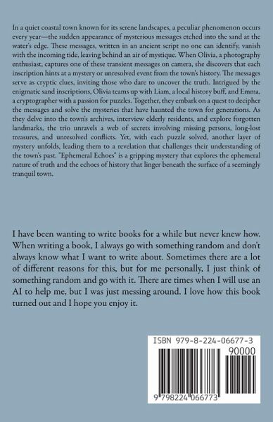 In a quiet coastal town known for its serene landscapes, a peculiar phenomenon occurs every year-the sudden appearance of mysterious messages etched into the sand at the water's edge. These messages, written in an ancient script no one can identify, vanish with the incoming tide, leaving behind an air of mystique. When Olivia, a photography enthusiast, captures one of these transient messages on camera, she discovers that each inscription hints at a mystery or unresolved event from the town's history. The messages serve as cryptic clues, inviting those who dare to uncover the truth. Intrigued by the enigmatic sand inscriptions, Olivia teams up with Liam, a local history buff, and Emma, a cryptographer with a passion for puzzles. Together, they embark on a quest to decipher the messages and solve the mysteries that have haunted the town for generations. As they delve into the town's archives, interview elderly residents, and explore forgotten landmarks, the trio unravels a web of secrets involving missing persons, long-lost treasures, and unresolved conflicts. Yet, with each puzzle solved, another layer of mystery unfolds, leading them to a revelation that challenges their understanding of the town's past. "Ephemeral Echoes" is a gripping mystery that explores the ephemeral nature of truth and the echoes of history that linger beneath the surface of a seemingly tranquil town.