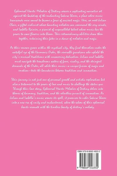 "Ephemeral Hearts: Melodies of Destiny" unfolds within the mystical city of Sakura Shores, where music wields the power of ancient magic. Julian Clair, a violinist whose melodies command the winds, and Isabella Rainier, a pianist whose music can bloom flowers, find their destinies intertwined. Their music, a blend of magic and emotion, faces the scrutiny of the Harmonic Order, guardians of the city's musical traditions. As they navigate fame, rivalry, and the Order's challenges, their love and music become a testament to the harmony of tradition and innovation. This tale of love, magic, and music dances between fantasy and reality, echoing the ethereal beauty of a love story that seeks to harmonize the old with the new, leading Sakura Shores into a new era of unity and enchantment.