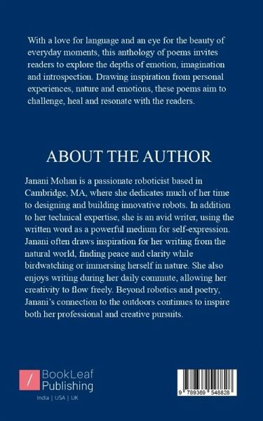 With a love for language and an eye for the beauty of everyday moments, this anthology of poems invites readers to explore the depths of emotion, imagination and introspection. Drawing inspiration from personal experiences, nature and emotions, these poems aim to challenge, heal and resonate with the readers.