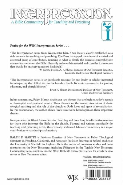 In his commentary, Ralph Martin singles out two themes that are high on today's agenda of theological and practical inquiry and planning. These themes are the cosmic dimensions of Christological teaching and the role of the church as God's locus and agent of reconciliation. In this examination, the author allows Paul's voice to be heard again on these important themes.