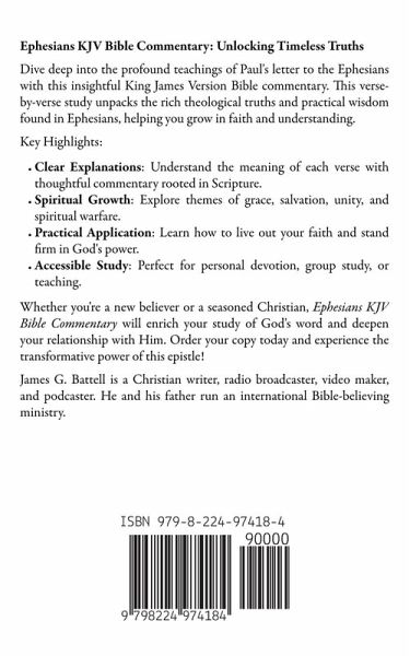 Introducing "Ephesians KJV Bible Commentary," a comprehensive and insightful guide that delves deep into the timeless wisdom of the Book of Ephesians. In this enriching commentary, readers will embark on a journey through the pages of this profound letter, gaining a deeper understanding of its historical context, theological significance, and practical application in today's world. Whether you're a seasoned theologian, a devoted Christian seeking spiritual growth, or simply curious about the teachings of Ephesians, this commentary is an invaluable resource that will illuminate your study of the Scriptures. Unveiling the layers of meaning within each verse, "Ephesians KJV Bible Commentary" offers readers a fresh perspective on this epistle attributed to the Apostle Paul. From exploring the themes of unity and reconciliation to unpacking the mysteries of God's grace and salvation, this commentary provides clear and insightful explanations that resonate with both the heart and the mind. Each chapter is accompanied by thorough commentary, offering historical context, linguistic insights, and practical applications that will deepen your appreciation for the profound truths contained within Ephesians. With its faithful adherence to the King James Version (KJV) of the Bible, this commentary stays true to the rich language and poetic beauty of the original text, allowing readers to experience the timeless wisdom of Ephesians in all its glory. Whether you're studying alone, with a small group, or as part of a larger congregation, this commentary is a valuable companion that will enrich your understanding of Ephesians and strengthen your faith journey. Beyond merely providing commentary, "Ephesians KJV Bible Commentary" serves as a guide for personal reflection, group discussion, and sermon preparation. Its user-friendly format makes it accessible to readers of all backgrounds and levels of biblical knowledge, while its scholarly rigour ensures accuracy and depth of insight. Whether you're seeking inspiration, guidance, or a deeper connection to the word of God, this commentary is an indispensable resource that will enrich your study of Ephesians and deepen your relationship with Christ. In summary, "Ephesians KJV Bible Commentary" is more than just a book-it's a companion for your spiritual journey, a guide to the depths of Ephesians, and a treasure trove of wisdom waiting to be discovered. Whether you're seeking to deepen your understanding of Scripture, strengthen your faith, or simply explore the profound truths of Ephesians, this commentary is an invaluable resource that will inform, inspire, and transform your life. James G. Battell is a Christian writer, radio broadcaster, video maker, and podcaster. He also runs an international Bible-believing ministry with his father.