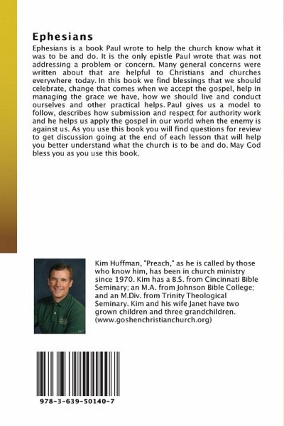 Ephesians is a book Paul wrote to help the church know what it was to be and do. It is the only epistle Paul wrote that was not addressing a problem or concern. Many general concerns were written about that are helpful to Christians and churches everywhere today. In this book we find blessings that we should celebrate, change that comes when we accept the gospel, help in managing the grace we have, how we should live and conduct ourselves and other practical helps. Paul gives us a model to follow, describes how submission and respect for authority work and he helps us apply the gospel in our world when the enemy is against us. As you use this book you will find questions for review to get discussion going at the end of each lesson that will help you better understand what the church is to be and do. May God bless you as you use this book.