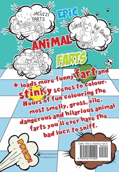 Epic Animal Farts Colouring Book 'Cos Farts Are Always Funny Funny fart and stinky scenes to colour. Hours of fun colouring the most smelly, gross, vile, dangerous and hilarious animal farts you'll ever have the bad luck to sniff. Each of the individual drawings is specially printed on a single page with the reverse left blank so you can cut out and keep, to create a picture perfect for framing or displaying in your bedroom.