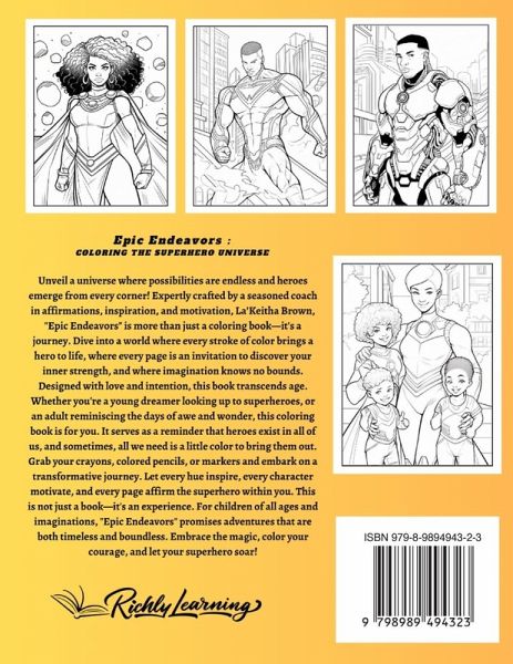 "Epic Endeavors: Coloring the Superhero Universe" is a captivating coloring book that takes you on an awe-inspiring journey through the vast and vibrant superhero universe. Each page of this book is a gateway into a world of extraordinary beings, where the fate of universes rests in the hands of larger-than-life heroes. As you flip through the pages, you'll discover a rich tapestry of scenes, each waiting to be brought to life with your creativity and imagination. The book features a diverse array of superheroes. These heroes are depicted in a multitude of scenarios - from epic battles in the skies above futuristic cities, to contemplative moments within secret lairs and otherworldly realms. "Epic Endeavors" illustrations are a blend of intricate details and bold, dynamic lines, suitable for colorists of all skill levels. Whether you're a young fan excited about superheroes, an adult seeking a creative outlet, or a seasoned artist looking for inspiration, this book offers something for everyone. Moreover, "Epic Endeavors" is designed to spark your imagination. Blank panels are included for you to sketch and color your own superhero scenes, encouraging you to become a creator in this thrilling universe. Perfect for a relaxing afternoon or as a gift for the superhero enthusiast in your life, "Epic Endeavors: Coloring the Superhero Universe" is more than a coloring book-it's an invitation to a world where your artistic flair can soar as high as the heroes within its pages.