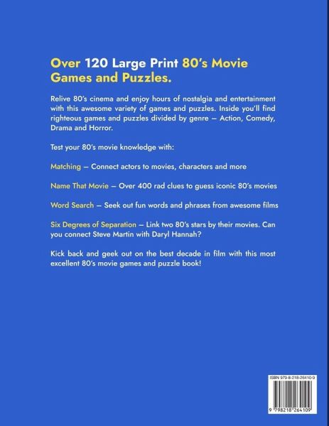 Relive 80's cinema with a variety of fun word games and puzzles. ¿ Over 120 Word Games and Puzzles ¿ Large-Print ¿ Divided by genre: Action, Comedy, Drama and Horror ¿ Matching Games, Name That Movie clues, Word Searches, Six Degrees of Separation ¿ Answer Key at the end of each section ¿ Fun for both casual movie fans and hardcore movie buffs ¿ Perfect gift for teens, adults & seniors