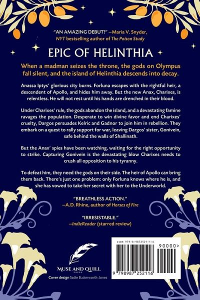 EXPLORE THE UNTOLD EPIC OF ANCIENT GREECE! Anassa Iptys' glorious city burns. Forluna escapes with the rightful heir, a descendent of Apollo, and hides him away. But the new Anax, Charixes, is relentless. He will not rest until his hands are drenched in their blood. Under Charixes' rule, the gods abandon the island, and a devastating famine ravages the population. Desperate to win divine favor and end Charixes' cruelty, Dargos persuades Kelric and Gadnor to join him in rebellion. They embark on a quest to rally support for war, leaving Dargos' sister, Gonivein, safe behind the walls of Shallinath. But the Anax' spies have been watching, waiting for the right opportunity to strike. Capturing Gonivein is the devastating blow Charixes needs to crush all opposition to his tyranny. To defeat him, they need the gods on their side. The heir of Apollo can bring them back. There's just one problem: only Forluna knows where he is, and she has vowed to take her secret with her to the Underworld. Epic of Helinthia is the first in a series of four. An original Greek myth of warring gods and the mortals who must find a way to end the conflict before it destroys their world. ~*~*~*~ "An AMAZING DEBUT filled with gods and goddesses, heroes and villains, love and loss, blood and tears: everything a fantasy novel needs to keep readers turning the page late into the night!" - Maria V. Snyder, New York Times Bestselling author of The Poison Study "Epic of Helinthia is A PAGE-TURNER OF AN EPIC-FANTASY DEBUT! Inspired by ancient Greek culture and mythology (and well-researched, too), this story is rich with political intrigue, plot twists, and betrayal, oh my! Can't wait to see what happens next." - Sharon Lynn Fisher, author of Salt & Broom