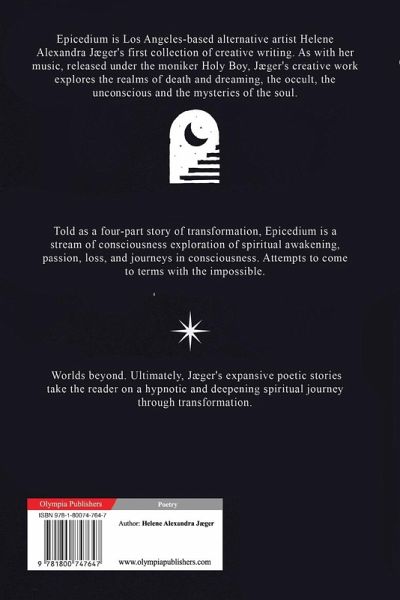 Epicedium is Los Angeles-based alternative artist Helene Alexandra Jæger's first collection of creative writing. As with her music, released under the moniker Holy Boy, Jæger's creative work explores the realms of death and dreaming, the occult, the unconscious and the mysteries of the soul. Told as a four-part story of transformation, Epicedium is a stream of consciousness exploration of spiritual awakening, passion, loss, and journeys in consciousness. Attempts to come to terms with the impossible. Worlds beyond. Ultimately, Jæger's expansive poetic stories take the reader on a hypnotic and deepening spiritual journey through transformation.