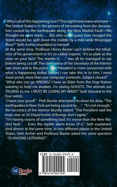 "Why is all of this happening now?! The nightmares have returned...The United States is in the process of recovering from the devastation caused by the earthquake along the New Madrid Fault...We thought we were ready . . . But who could guess how ravaged the States would be split down the middle by a mile wide Mississippi River?" Seth Archer mumbled to himself. At the same time, Professor Henry Baxter can't believe the blindness of his government or it's so-called experts. "It's as plain as the nose on your face! The mantle is . . ." was all he managed said before being cut off. The stern voice of the Secretary of the Interior was short and to the point, "The President is more concerned with what is happening today! Before I can take this into him, I need more proof, more than just computer printouts. Subject closed!" "What else can go WRONG? I have an Elder from the Hopi Nation wanting to help me awaken. I'm seeing GHOSTS. The animals are TALKING to me. I MUST BE LOSING MY MIND!" Seth shouted to the four winds. "I have your proof!" Prof. Baxter attempted to show his data, "The earthquakes in New York are being caused by . . ." "It's not enough," the Secretary of Interior bluntly stated. "The President said the boys over at US Geological Services don't agree." "I'm having visions of something bad. It's worse than the New Madrid fault . . . Even the reptile aliens know of it," Seth explained. And almost at the same time, in two different places in the United States, Seth Archer and Professor Baxter asked the same question - "IS ANYONE LISTENING?"